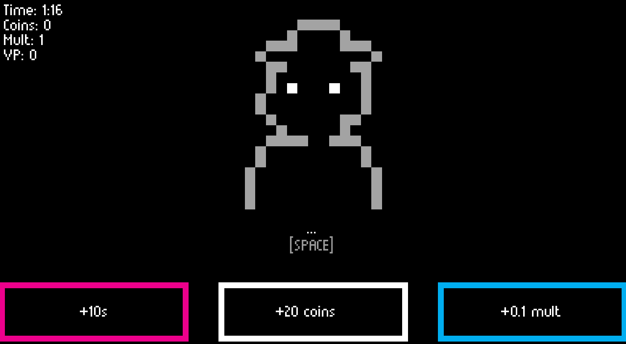 -If you want a shortcut, you can hold V + P + Q you get free victory points and if you hold M + T + R you get free seconds/s. The final cutscene is activated when you have 5<VP<10 and <1 seconds/s